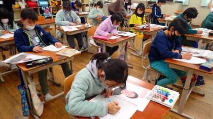 全校のみんなでお世話になったたてわりグループの6年生へメッセージを書きますが、そのメッセージを入れる封筒には、4年生の子どもたちが描いた似顔絵を貼り付けます。6年生の写真を見て、ていねいに、心をこめて描いています。