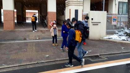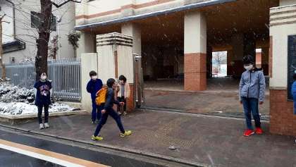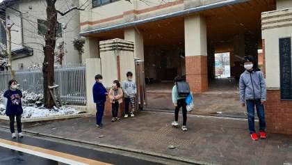 正門では、13グループの子どもたちがあいさつをしました。雪が降って寒い朝でしたが、しっかりがんばってくれました。
