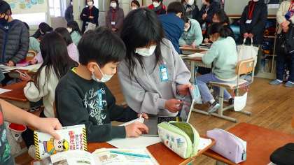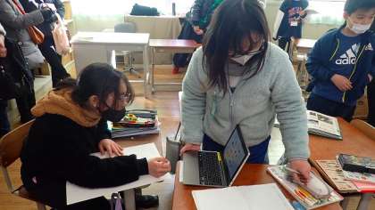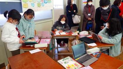 調べるときには、図書のほか、GIGA端末を使ってインターネットを活用していました。参観に来てくださった保護者の方にもお話を聞かせていただいている子どもたちもいました。