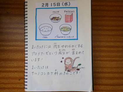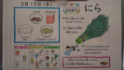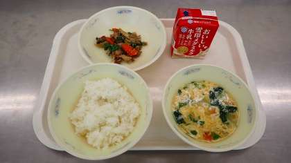 「プルコギ」「中華コーンスープ」は、子どもたちに人気の献立です。今日も、朝から楽しみにしていた子どもがたくさんいたようです。甘辛く味付けした牛肉と、たまねぎ、にんじん、まいたけを一緒にいただきました。ごはんにぴったりの献立で、いつも以上にごはんをたくさん食べることができました。「中華コーンスープ」はとろみのあるスープとふわふわの卵をおいしくいただきました。