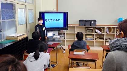 学級を4つのグループに分け、それぞれに用意した大型テレビを使ってプレゼンを映して発表をしました。どんな自分になりたいのかを聴き手に伝え、聴き手もコメントを返していました。