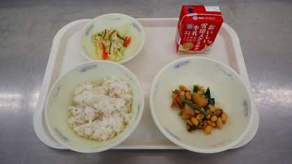 今日の「肉みそいため」は、八丁みそが使われていてコクがあります。具材にもよく味が染みており、ごはんによく合う献立でした。「ごま酢煮」は、酢のさっぱりした酸味がちょうどよく、肉みそいためと交互においしくいただきました。