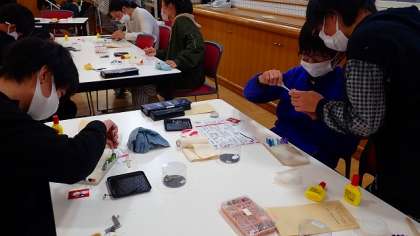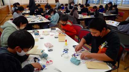 細かい作業をするので、根気のいる時間が続きます。集中して一心不乱に取り組む子、ときどき息抜きをしながらがんばる子と取り組み方は様々ですが、みんな楽しそうにつくりました。難しいところは、先生がていねいに教えてくださいました。また、「小さい先生」も大活躍でした。
