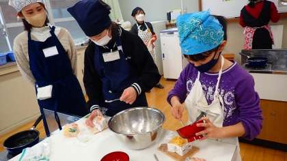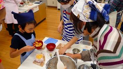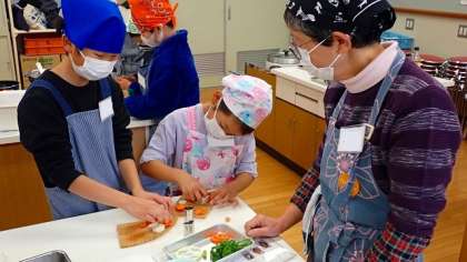 酢飯や具材の準備が整ったら、いろいろ「ケーキ寿司」をつくります。型の中に酢飯を入れ、卵そぼろやにんじん、だいこん、菜の花でトッピングをしていきます。みんな楽しそうです。