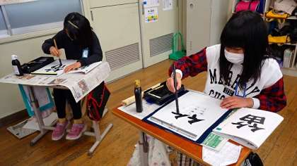 はじめに、文字の形や画の長さ、画の接し方などを確かめるために、お手本のなぞり書きをしました。その後、「ほねがき」や「かご字」などで練習をしてから清書をしました。みんな、集中して書いていました。