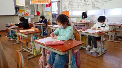今日は、単元の学習をふり返る確認テストを行いました。自分の力で問題を読み、答えていきます。みんな集中してテストに取り組みました。