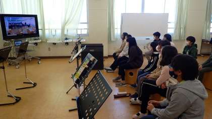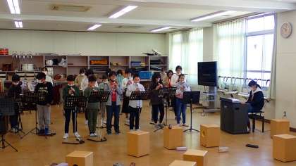これまで練習してきた「威風堂々」の合奏をいよいよ仕上げました。みんなで合奏している様子をGIGA端末で録画し、自分たちで聴いてみました。演奏の中で気になったところや、もっとよくできそうなところについて意見を出し合っています。その後、もう一度演奏すると、みんなポイントを意識した演奏をすることができました。