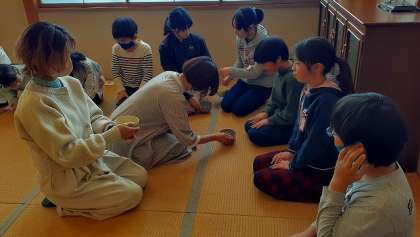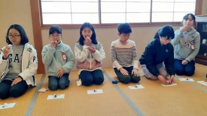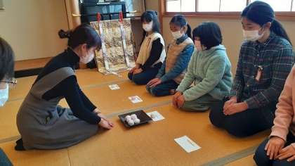 続いて、お菓子をいただきました。懐紙に乗せたお菓子を黒文字で上手に切り、少しずつ口に運びました。そして、いよいよ抹茶をいただきます。茶碗を運んでくださった保護者のボランティアの方にお辞儀をして、お茶をいただきました。