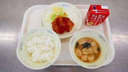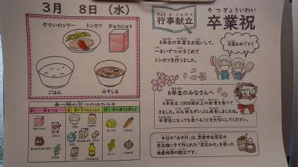 今日は、6年生の卒業をお祝いする「卒業祝献立」です。子どもたちは、今日の「トンカツ」を楽しみにしていました。給食時間が近づくと、とてもよいにおいが漂ってきました。トンカツは、給食調理員さんが1枚1枚ころもをつけて、心をこめて揚げてくださいました。豚肉のジューシーさがぎゅっと詰まった、とてもおいしいトンカツでした。6年生のみなさんにも、きっと、給食調理員さんの卒業をお祝いする気持ちが伝わったことでしょう!
