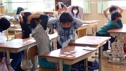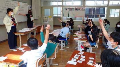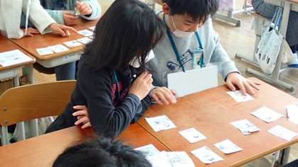 たくさんの日課の言い方に慣れ親しむために、ALTの先生が3つ連続で読まれる日課を聞き取り、机の上のたくさんのカードの中から見つけ出しています。全て聞き取れなくても、一部分でも聞き取ることができれば、カードを見つけ出すことができます。ペアで協力して活動に取り組んでいました。