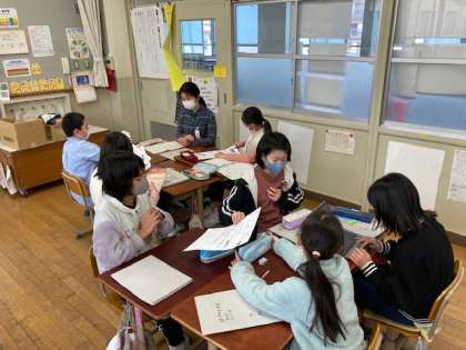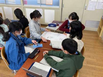 学校のためにしてみたいと思ったことをもとに、同じ思いを持った友達と会社をつくり、その会社が行うことを考えたり、実際に行うことに向けて会議や制作活動をしたりしています。