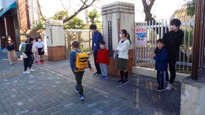 今日は、今年度最後の「たてわりあいさつ運動」でした。1月の大雪の日にあいさつをする予定だった7・8グループの子どもたちが、元気にあいさつをしました。