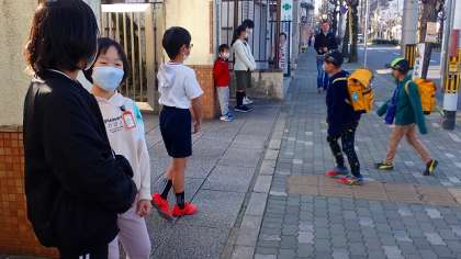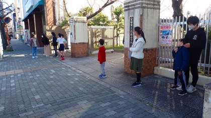 通用門では、8グループの子どもたちが、明るく元気な声であいさつをしています。お仕事に行かれる方からも、「気持ちのよいあいさつだね!」と言っていただきました。