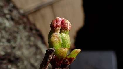 通用門横の桜を見てみると、ピンク色の花びらがのぞいているものもあります。乾隆小学校の桜の開花も、もうすぐです。