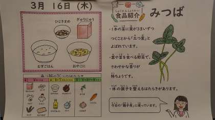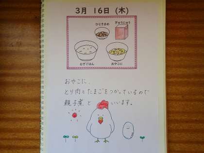 「親子煮」は、鶏肉と卵を使った料理です。甘いおだしの味が、鶏肉と卵にぴったりです。みつ葉の味がアクセントになっていて、ごはんと一緒においしくいただきました。