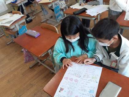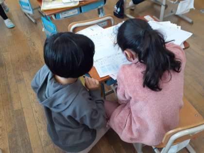どこを間違ったのか、一つ一つ確認する2年生で、丁寧に直しをしていました。わからないところは、友だちと一緒に考えていました。