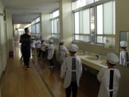 まずは、洗面所で手を洗います。きれいに手洗いをした後、消毒をして、給食室へ入っていきます。