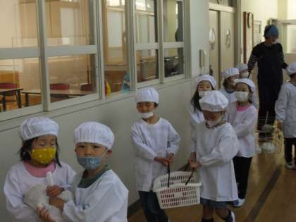 その後、自分が担当する給食を受け取り、お友だちと協力して教室まで運んでいきました。