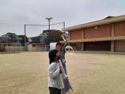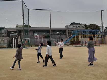運動場で、「ビック バブル」「アップ、アップ」とお話しながら、外国語活動を楽しんでいました。