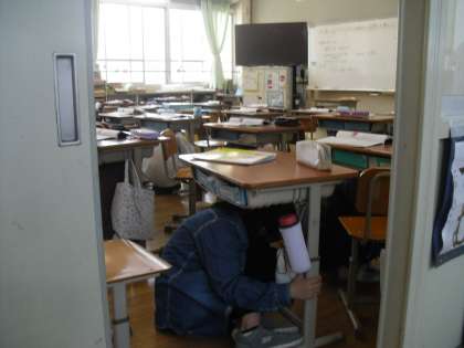 事前指導の後は、訓練を実施します。突然スピーカーから聞こえてきた地鳴りの音に素早く反応し、みんな机の下に体を入れました。大変素早い動きでした。