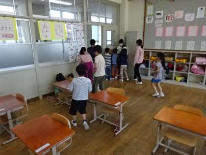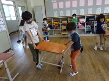 1年生は、6年生に掃除の手伝いをしてもらいながら掃除を一生懸命がんばっています。6年生の仕方をお手本にして、ぞうきんがけやほうきの使い方が上手になってきています。机運びも一緒にがんばっています。