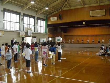 2年生は「小犬のビンゴ」の曲に合わせて、替え歌をプレゼントしました。歌ったり、プレートをあげたりしました。2年生は、1年生への気持ちがあふれる内容で楽しい時間を過ごしました。