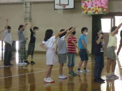 5年生は、昨年のキャンプファイヤーで行ったスタンツ「クワガタ音頭」をしました。元気いっぱい楽しさいっぱいを1年生のみんなに伝えてくれました。だんだんクワガタの数が増えていき、最後には全校のみんなでクワガタになる盛りがった出し物となりました。