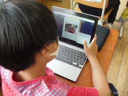 今日は、畑で見つけた植物の観察しました。ロイロノートスクールを活用して、色や形、大きさなどをカードに書き込んでいました。