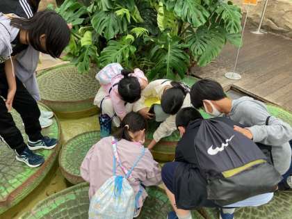 ドクターフィッシュのコーナーでは、順番に「怖いよ」「大丈夫だよ」と声をかけ合って恐る恐る体験していました。