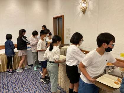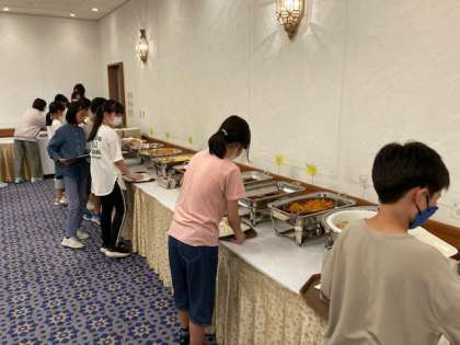 ビュッフェ形式の夕食です。たくさんの料理から、食べたいものを選んでいたようです。好きなものだけでなく、バランスを意識して選べたでしょうか。