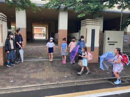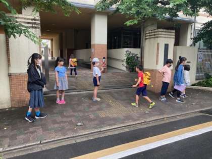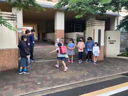 たてわりグループの友だちといっしょに並んであいさつします。だんだん声も大きくなっていき、元気なあいさつができました。
