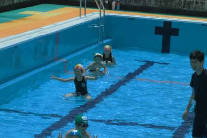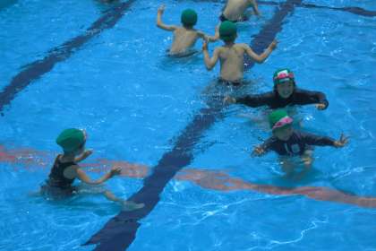 先週に続き、今年度2回目の水あそびです。今日は、前回よりも少し水位を上げて学習しました。まずは、「カニさん歩き」に挑戦しました。
