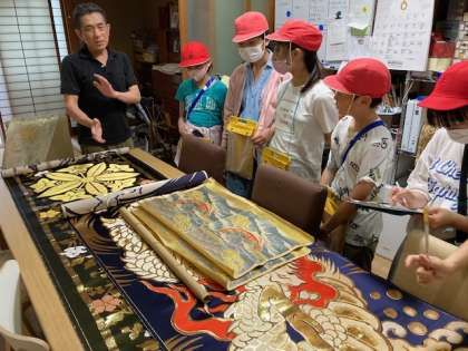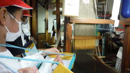 昨年度、手機織体験をしている子どもたちですが、繊細な手機の西陣織の織物に、とても驚いている様子でした。