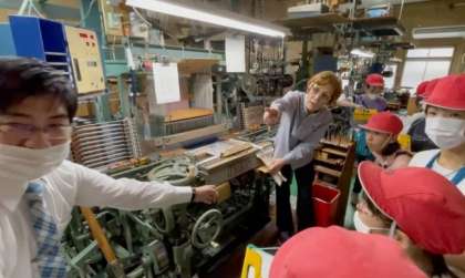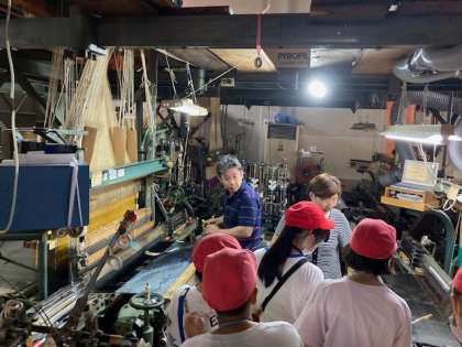 次に、「力織機」の見学をさせていただきました。手機とは違い、機械で織り進める力織機の動く速さに、子どもたちは驚いていました。また、機械といってもすべてをしてくれるのではなく、人の手で調整をしながら進めていかなければならないことも知りました。