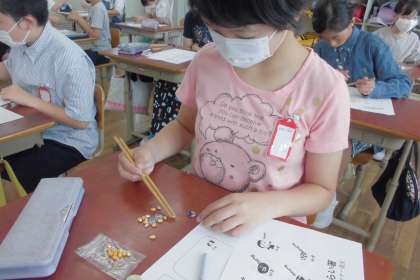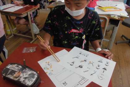 また、お箸の持ち方も教えてもらい、ポップコーンの種やおはじきを掴んだり、ティッシュペーパーを使って魚をほぐしたりする練習をしました。