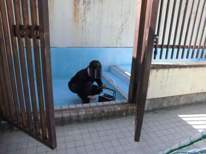 プールの足洗い場、腰洗い槽、シャワー、そして、はだしの生活でお世話になった運動場の足洗い場をきれいにしていきます。浮いてきている古い塗装をはがし、丁寧に塗っていきました。