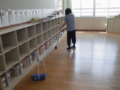 ワックスをかける前に、掃き掃除とモップで水拭きを行います。