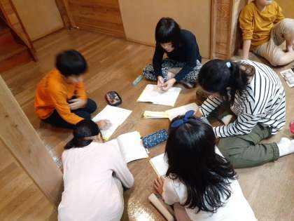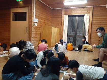 ナイトハイク終了後、1日目の振り返りをしています。