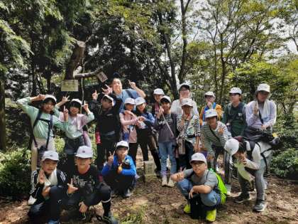 目的地点に到着し、記念撮影をしました。山の上から見る景色は最高です。