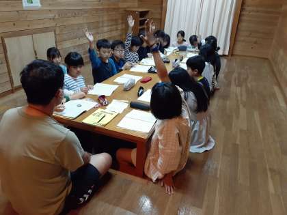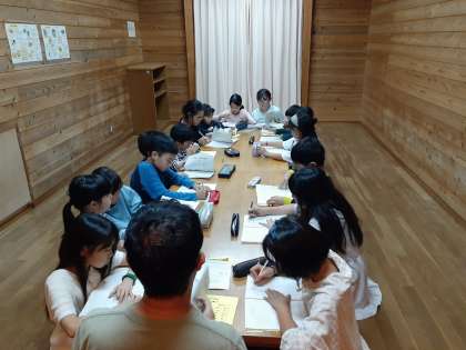 キャンプファイヤー後の振り返りは、机を囲んで話し合いました。良い意見もたくさん出ました。