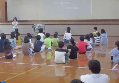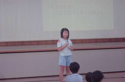 3年生は、「おうちの人へのありがとうの気持ち」や「たてわり遠足でお世話になっているリーダーへのありがとう」について、2名が作文を発表しました。聴いている子どもたちは、話し手の方を見て静かに聴いていました。