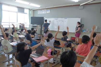 今日は、ALTの先生と「What time do you get up ?」の学習をしました。