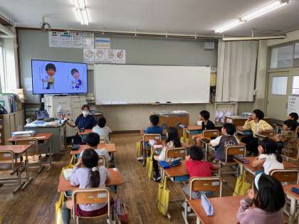 栄養教諭の先生に来ていただき、給食の正しい食べ方について教えていただきました。