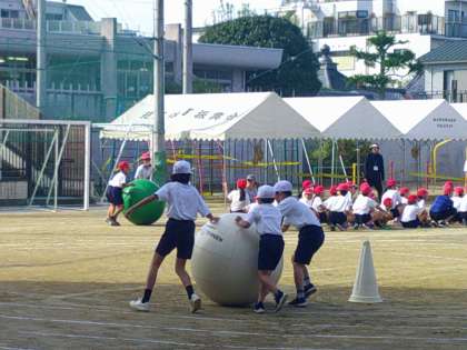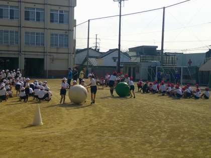 今日は、大玉ころがしの練習です。本番同様に、入退場も含めて練習しました。前回より、スピードも少し上がり、協力体制もばっちりです。