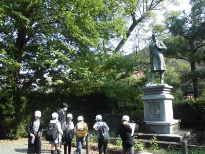 次に、インクラインの下をくぐりぬけるトンネル(ねじりまんぽ)を見学しました。渦を巻くような形で、らせん状に積まれたレンガづくりのトンネルには、先人の知恵と工夫がつまっています。インクラインを上がり切ったところから、疏水のトンネルの出口を確認しました。また、琵琶湖疏水の建設を指揮した田辺朔郎の銅像も見学しました。