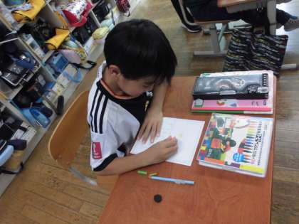 今日は、秋のものをたくさん見つけて発表しました。そして一人一人、とっておきの秋のものをカードに書いて、まとめていました。