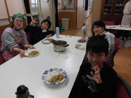いよいよ完成です!お家から持ってきたお皿に「和風カレー」を取り分けます。家庭科室は、おいしそうなカレーのにおいでいっぱいです。
