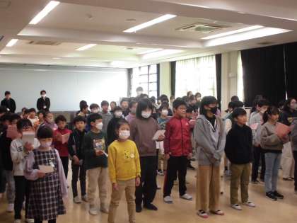 今月の歌「ともだちは いいもんだ」を全員合唱しました。多目的室では、きれいな音色が響いていました。