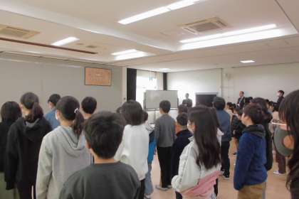 はじめに、校歌斉唱をしました。子どもたちの素敵な声が4階多目的室に響きました。次に、校長先生からのお話を聞きました。