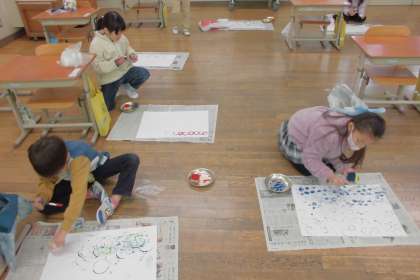 今日は、集めた材料に絵の具をつけて紙に写していきます。いろいろ試しながら、思い思いに作品をつくっていました。